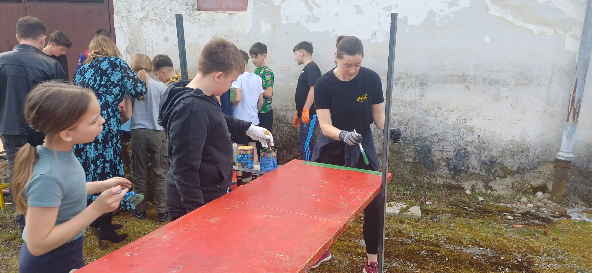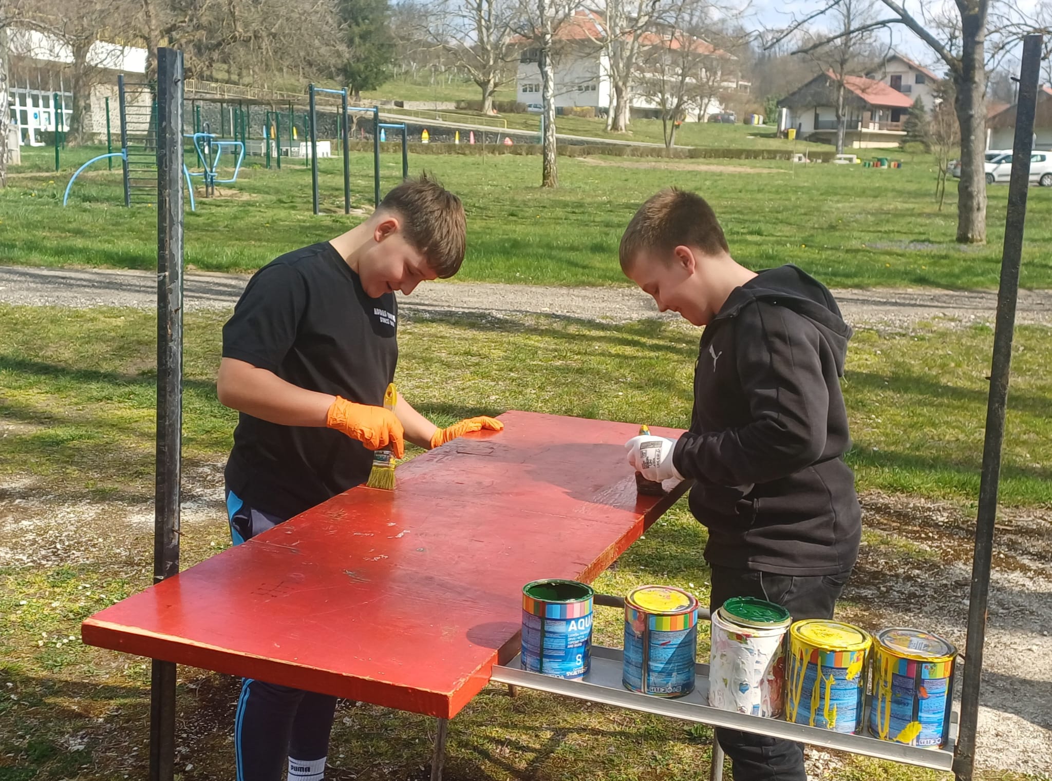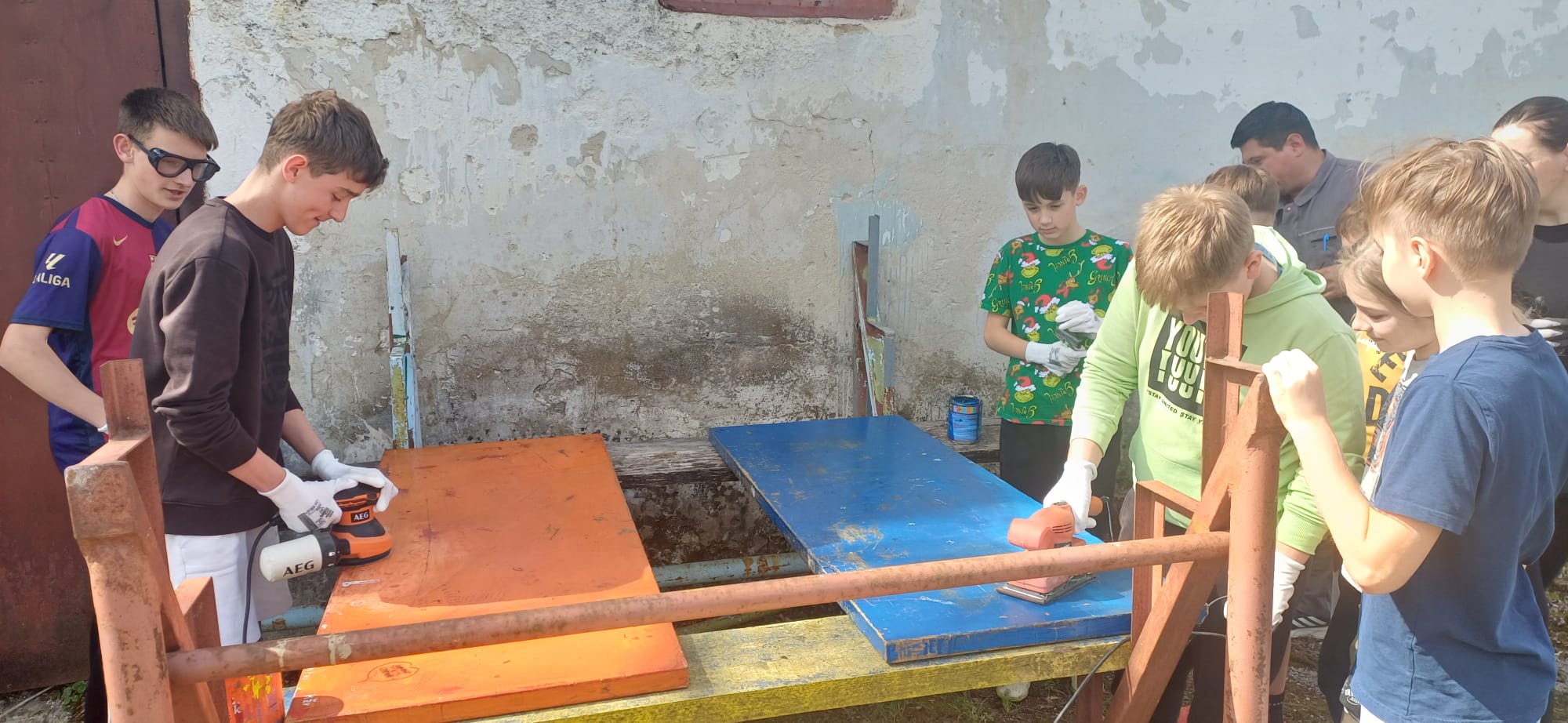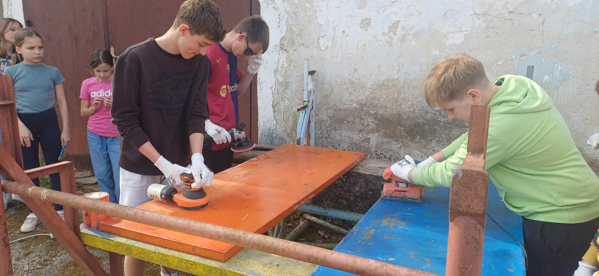 ⇒ Školski volonteri s puno entuzijazma prionuli su poslu - brušenjem i bojanjem udahnuli su novi život starim klupama te tako doprinijeli ljepšem i ugodnijem školskom okruženju!